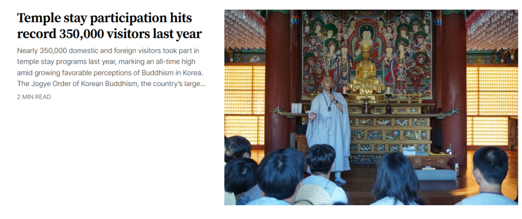 দক্ষিণ কোরিয়ায় বৌদ্ধ মন্দিরে অবস্থান করে ধ্যান ও ধর্মীয় অনুশীলনের সুযোগ দেওয়া টেম্পল স্টে কর্মসূচিতে অংশগ্রহণ গত বছর নতুন রেকর্ড অর্জন করেছে।